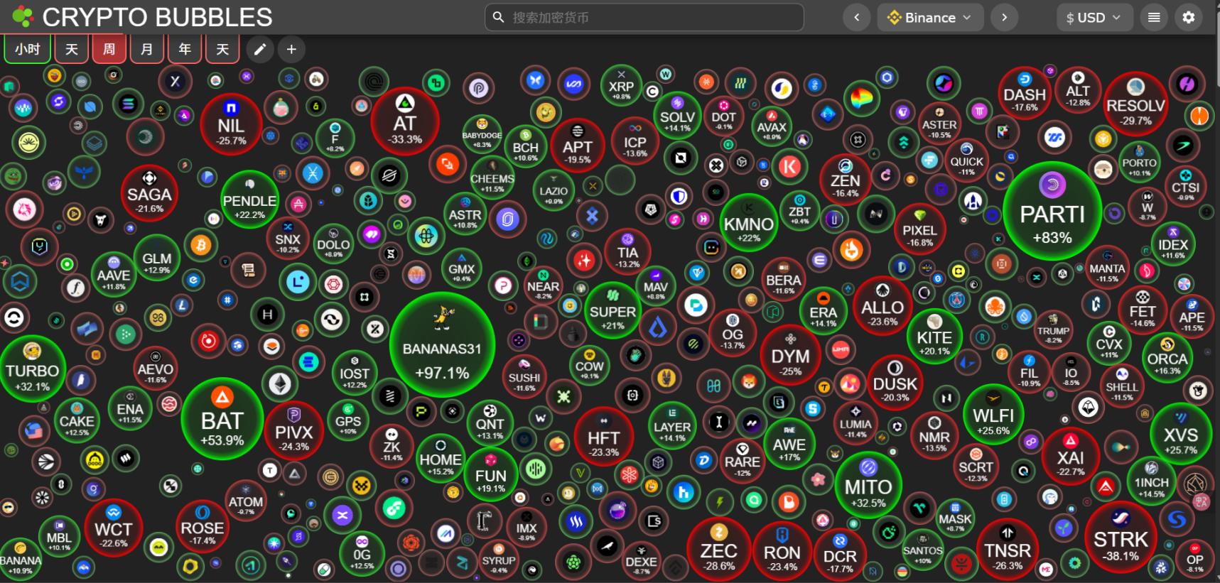本周山寨市场整体震荡走高,上周五曾预测只要美股企稳,反弹便一触即发。从盘面来看,小市值妖币相对活跃,但持续性较弱;其他代币跟随大盘上涨,不过山寨币整体涨幅有限,与 BTC 涨幅相近,反映出市场情绪尚未高涨。