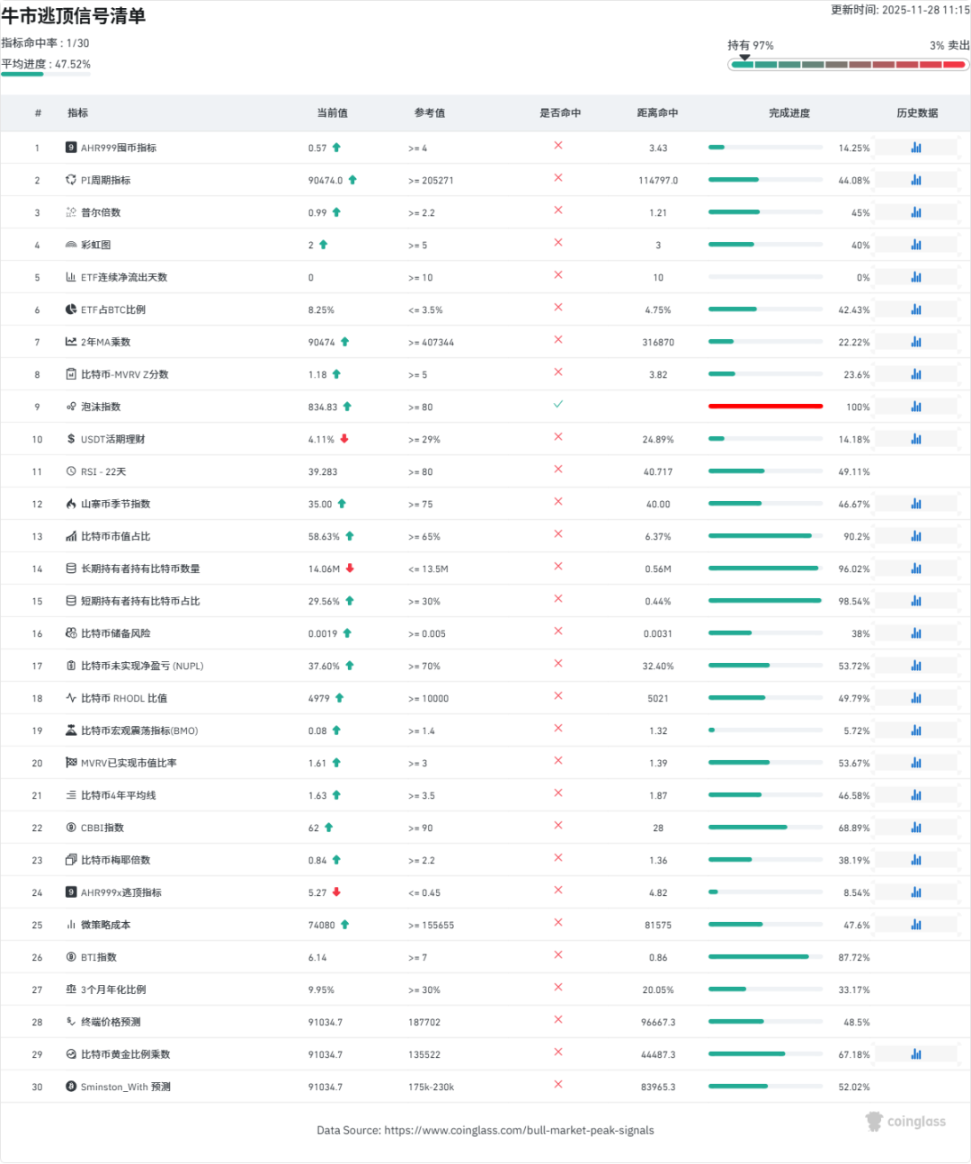 逃顶合集显示,本周泡沫指数出现预警,需结合其他指标综合判断市场情况,以确保分析更客观。