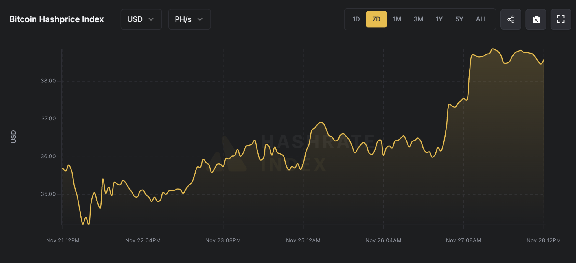 从单位算力每日收益(Hashprice)的角度观察,Hashrate Index 数据显示,截至 2025 年 11 月 28 日,Hashprice 为 38.56 美元 /PH/s/ 天。本周 Hashprice 与比特币价格走势基本一致,表现为回落后猛升高位趋势: