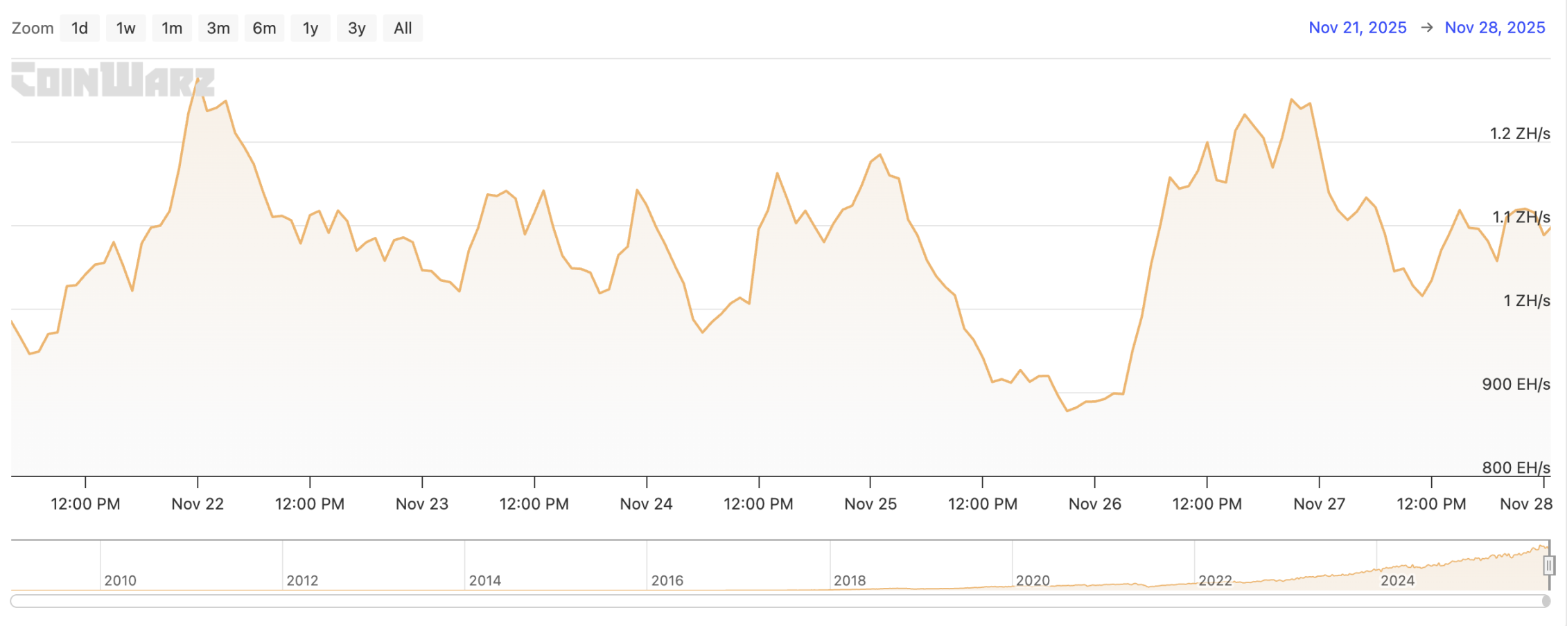 从趋势上看,比特币全网算力始终维持在 1 ZH/s 附近的高位区间,整体结构保持强势。虽然短周期内波动频繁,但均属于 高位震荡,并未出现趋势性下滑,显示算力底盘依旧稳固。本周的主要变化依旧与 比特币价格联动明显。11 月 25 日附近 BTC 出现阶段性回调 时,算力同步出现一次急促回落,最低触及 约 877 EH/s。随后随着价格快速修复,算力同样迅速反弹,并在 11 月 27–28 日逼近 1.15 ZH/s 的阶段高点,体现出矿业内的算力恢复速度和高成本环境下的韧性。