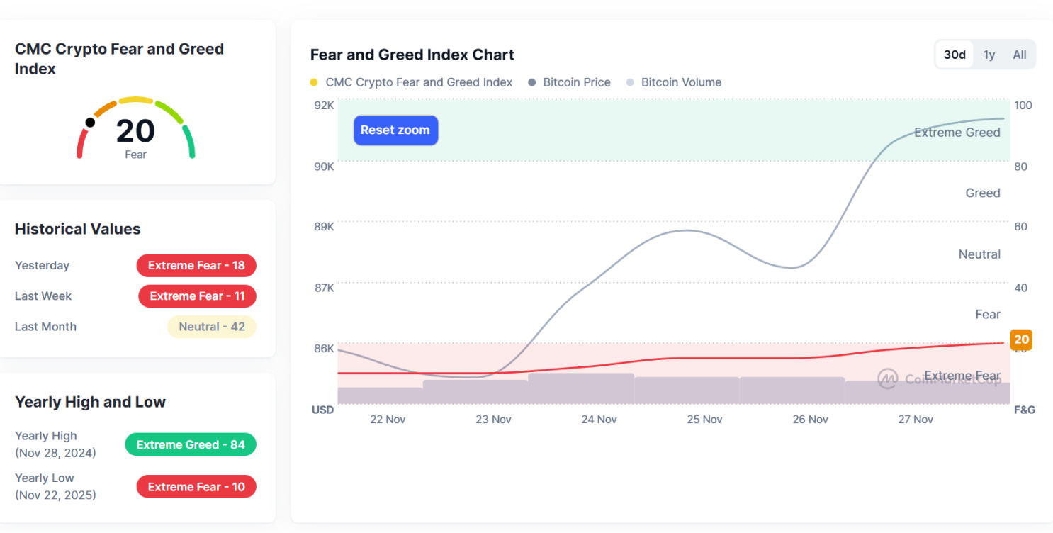 截至 11 月 28 日,「恐惧与贪婪指数」约为 20 点,处于“极度恐惧”区间。