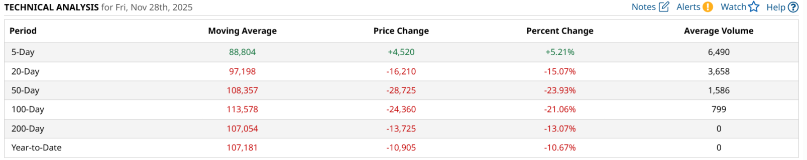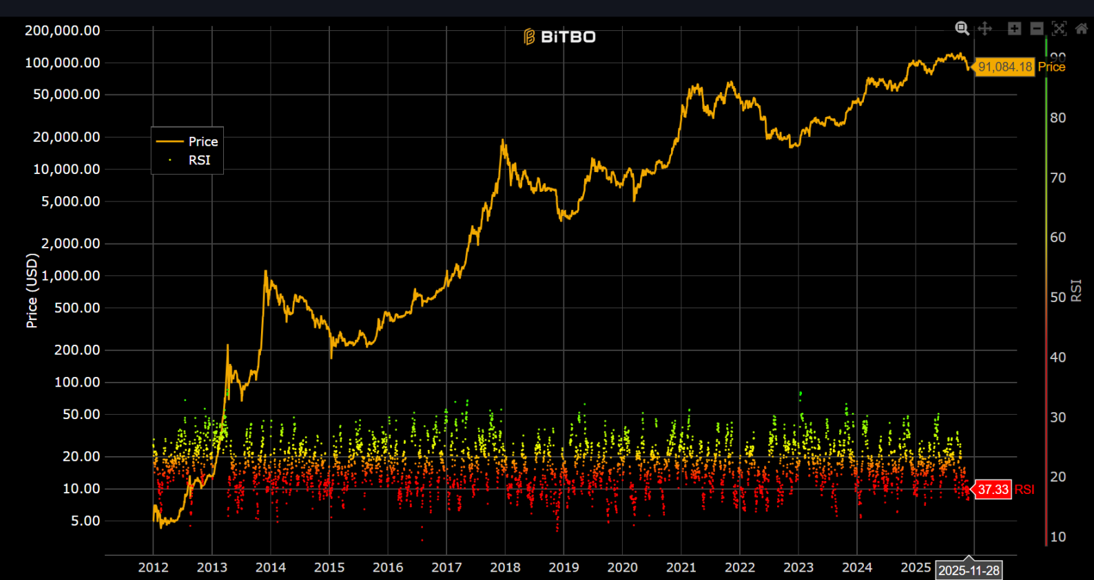 截至本周期末,比特币 14 日 RSI 为 37.33,未触及超卖 (RSI<30),较上周 40 略有下降,但仍处明显弱势区间内。RSI 持续位于 30–45 区间说明市场仍偏弱, 短线超卖压力有所释放,但反弹动能暂不足。