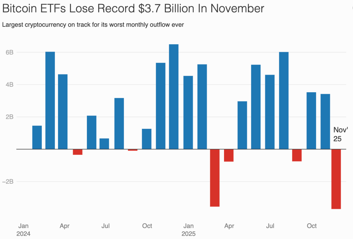 11 月 26 日消息,据福布斯报道,比特币现货 ETF 延续大规模赎回趋势,单月累计净流出已达 37 亿美元,刷新今年 2 月的纪录。受此影响,比特币自 10 月历史高位 12.6 万美元回调超 35%,期间最低触及 8 万美元,为 4 月以来低点。