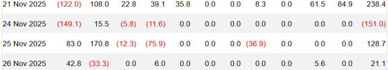 根据 Farside Investors 的 BTC‑ETF Flow 追踪数据,这种先流出后小幅回补,反映出市场在底部附近可能出现结构性动向反转。值得注意的是,尽管资金流入,但整体流入量仍远不能覆盖此前累计数亿美元规模的流出,市场流动性依然偏紧。综合来看,本周 ETF 资金逻辑体现为:在 11 月初至中旬的强烈赎回后,11 月 25 日 ETF 出现试探性回补,标志着机构对当前低价区的谨慎入场,有可能为中期筑底铺垫,但短期仍需观察资金能否持续流入。