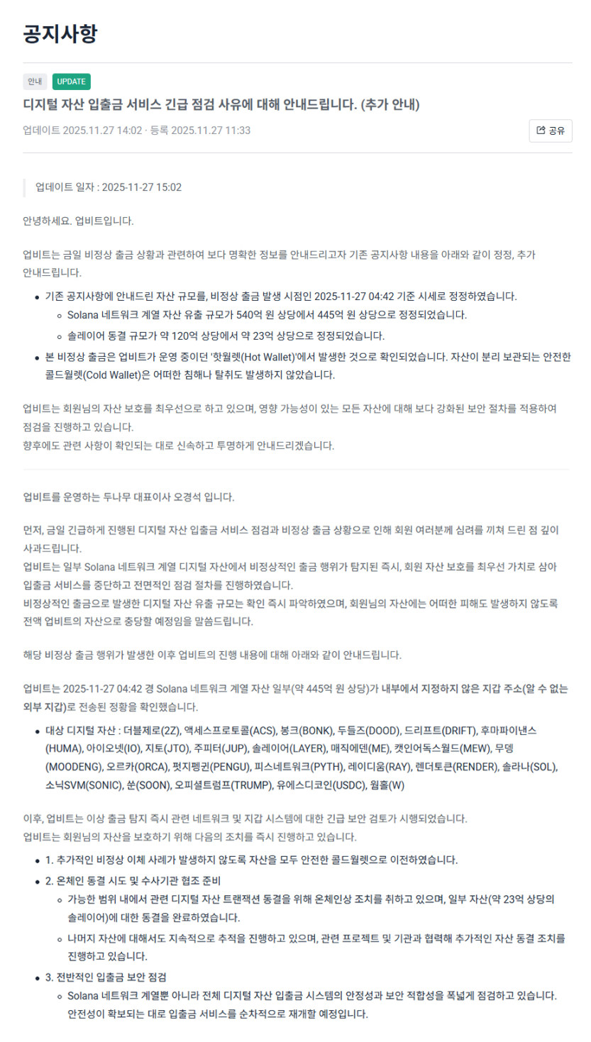 这一事件发生在 Upbit 运营方 Dunamu 与 Naver Financial 宣布合并计划的同一天,引发了市场对加密货币交易所安全性的广泛担忧。