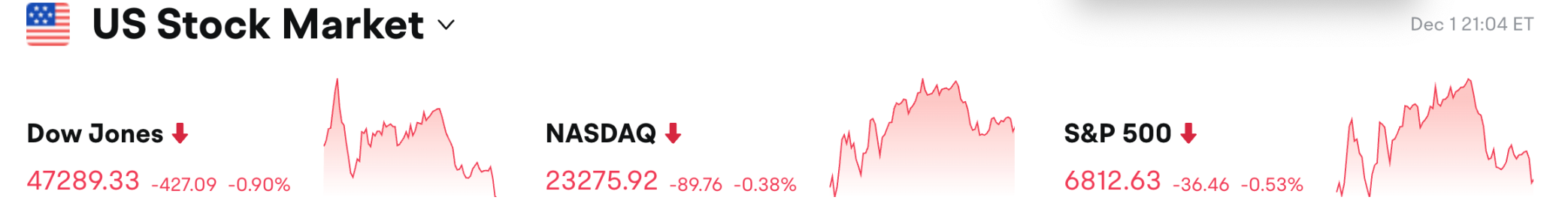 2、美股:道指跌 0.9%,标普 500 指数跌 0.53%,纳斯达克综合指数跌 0.38%。