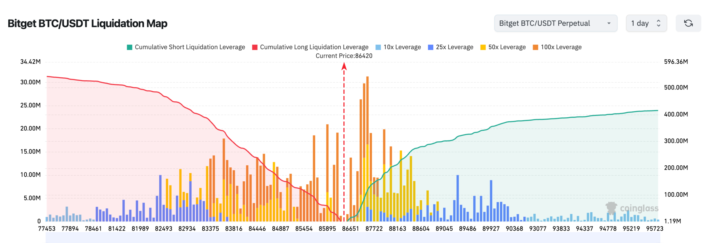 3、BTC 当前价位 86,420 美元正处于多头高杠杆密集爆仓区(约 85,400–88,000 美元)中心,下探易触发连续多头清算。空头清算主要分布在 88,500 美元以上,若价格上破该区间,可能引发空头加速平仓推动行情上行。