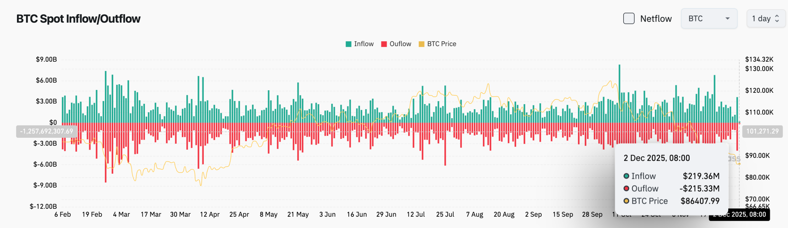 4、过去 24 小时内,BTC 现货流入 2.19 亿美元,流出 2.15 亿美元,净流入 0.04 亿美元。
