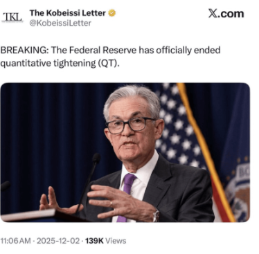 美联储正式结束 QT(量化紧缩)——全球风险资产最大的刹车被彻底松开。