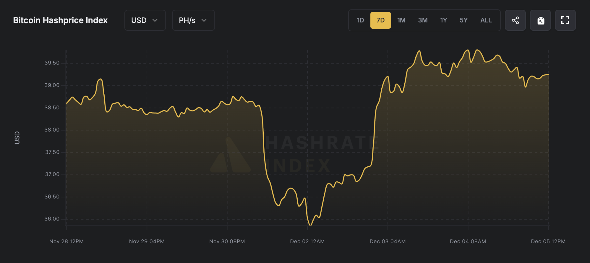 12 月 4 日:本周高点 39.80 美元 /PH/s/ 天