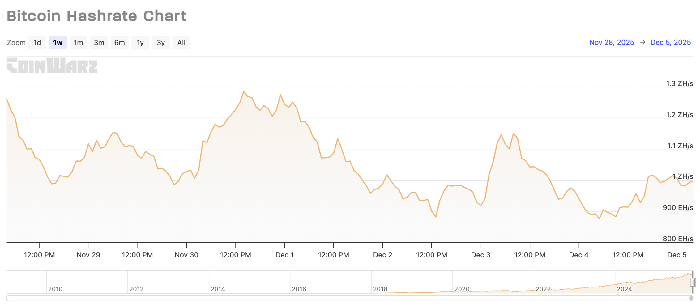 从趋势上看,比特币全网算力始终维持在 1 ZH/s 附近的高位区间,整体结构保持强势。虽然短周期内波动频繁,但均属于 高位震荡,并未出现趋势性下滑,显示算力底盘依旧稳固。本周的主要变化依旧与 比特币价格联动明显。12 月 2 日附近 BTC 出现阶段性回调 时,算力同步出现一次急促回落,最低触及 约 881 EH/s。随后随着价格快速修复,算力同样迅速反弹,并在 12 月 3 – 4 日逼近 1.15 ZH/s 的阶段高点,体现出矿业内的算力恢复速度和高成本环境下的韧性。