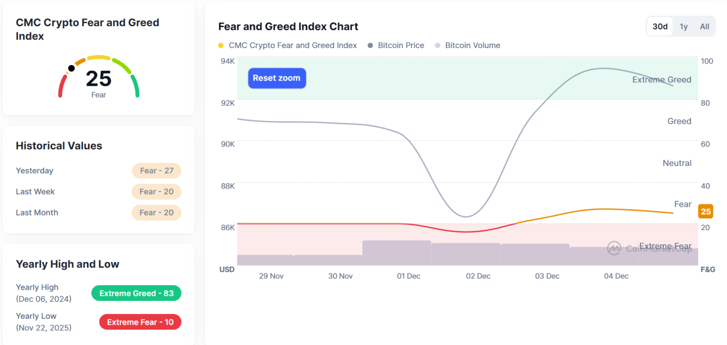 截至 12 月 5 日,「恐惧与贪婪指数」约为 25 点,处于“极度恐惧”区间。