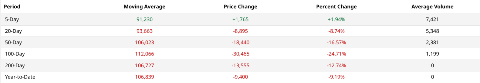 当前价格约为 $92,380,位于 MA5 上方,但远低于 MA20 / MA50 / MA100。这一结构意味着:短期反弹已开启,但中期与中长期均线尚未转向,多头趋势尚未建立。若比特币未能突破并稳定收复 MA20,反弹可能只是反转中的低幅修复而非新趋势开启。MA50 & MA100 的向下趋势尚未改变。