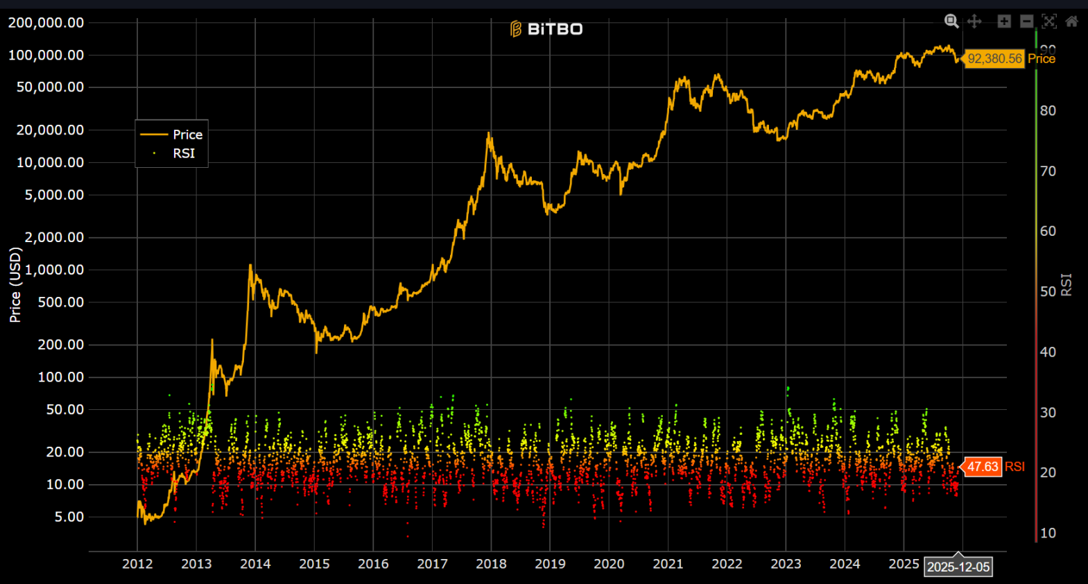 本周期末 RSI 为 47.63,接近中性位置,但尚未回到明显超买区 (RSI > 55–60)。与此前几周相比,本周 RSI 的抬升说明短线超卖压力部分释放,但尚不足以反映趋势性回暖。