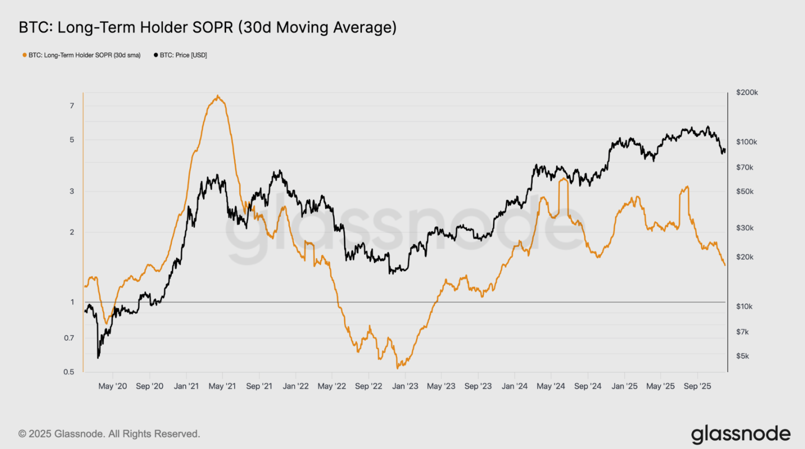 保持正资本流入的状态意味着新需求仍能吸收长期投资者的利润实现。长期持有者 SOPR(30D-SMA)衡量现货价格与长期持有者积极消费成本基差的比率,随价格大幅下跌,但仍高于 1(目前为 1.43)。这一利润率的新兴趋势再次反映了 2022 年第一季度的结构:长期持有者继续以利润为本,但利润率正在缩小。