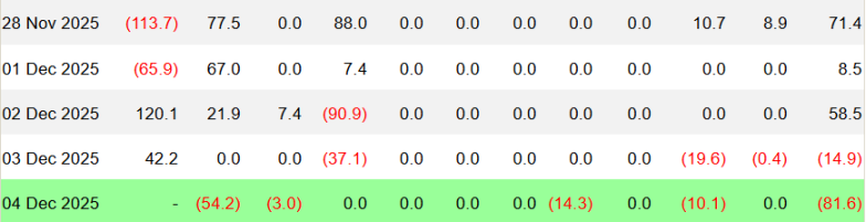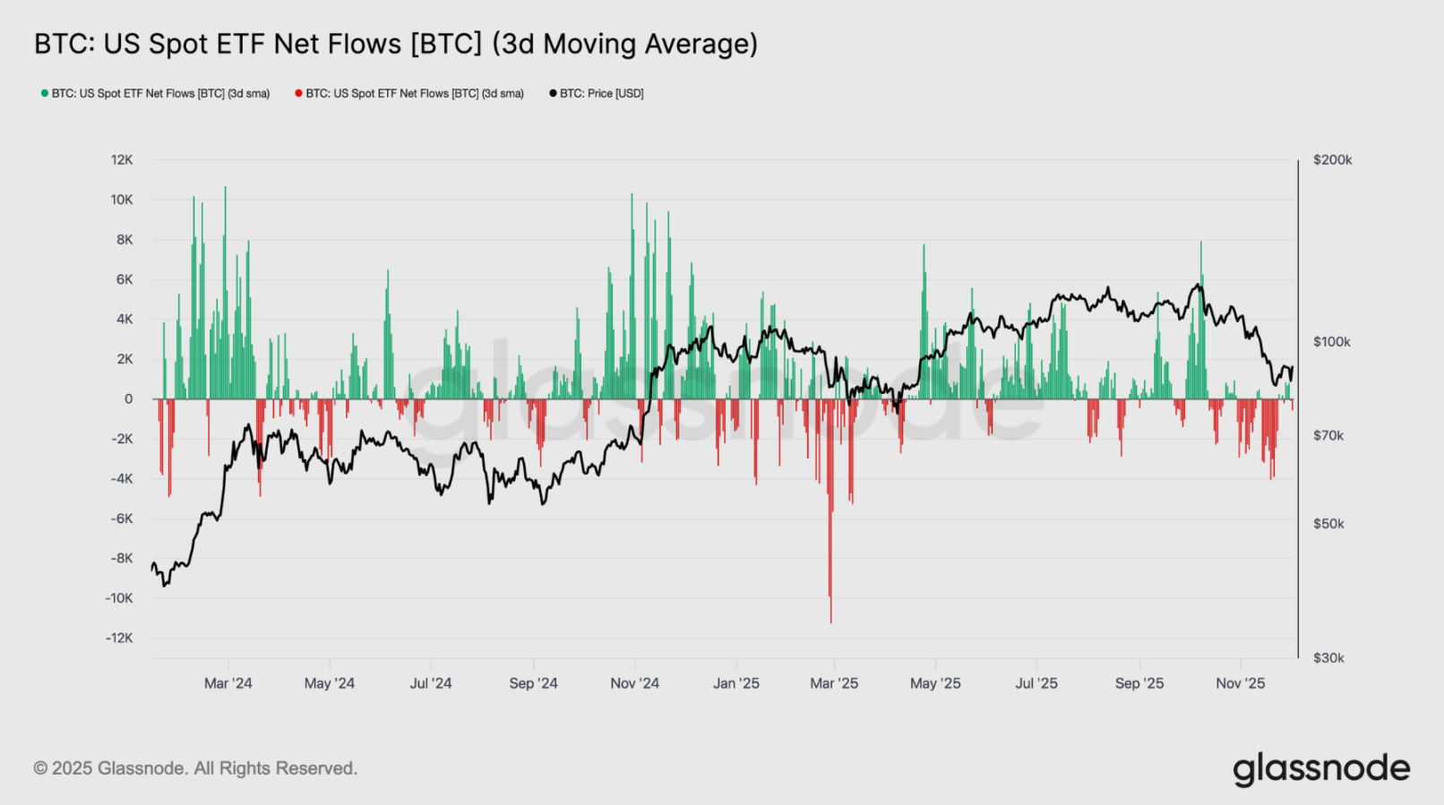 美国比特币 ETF 的净流动明显恶化,11 月期间 3 日平均值稳固地滑入负区间。这明显扭转了年初支撑价格的持续流入机制,反映出新资本配置的降温。各发行人普遍存在资金流出,显示机构参与者在市场状况转弱下采取更为谨慎的态度。现货市场面临需求减弱的背景,这削弱了买方的直接支撑,价格对外部冲击和宏观波动性更加敏感。
