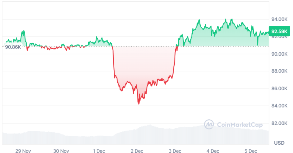 本阶段,比特币整体走势表现为 “窄幅整理 → 突发跳水 → V 型反弹 → 高位震荡”。价格运行区间大致介于 $84,286–$94,010 之间,波动区间达近万美元,走势振幅剧烈。12 月 1 日至 2 日间出现明显深跌,而后强力反弹,3 日后市场恢复向上,价格逐步站稳 $92,000 上方。