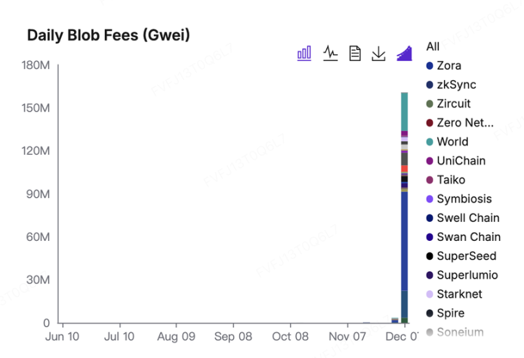 费用市场的再平衡主要体现在 EIP-7918 对 Blob 的定价逻辑调整上。Dencun 之后,Blob 一度处于“几乎免费”的状态——最低费用只有 1 wei,L2 在需求不高时几乎零成本占用数据可用性空间。Fusaka 为 Blob 引入了与 L1 base fee 挂钩的保底价格,即便需求低迷,L2 也必须支付一个与主网 gas 水平成比例的“过路费”。升级落地后,Blob base fee 从 1 wei 迅速抬升到千万级别 wei 的新均衡区间,每日 Blob 手续费在统计图上出现“跳阶式”抬升,贡献主力集中在 Base、World Chain 与 Arbitrum 等头部 L2。一方面,这意味着以太坊 DA 不再是“免费增量”,L2 需要为占用的结算与数据空间持续买单;另一方面,这部分费用进入 EIP-1559 框架,转化为验证者补贴和 ETH 燃烧,重新强化了 ETH 作为全球结算与数据可用性层的价值捕获能力。