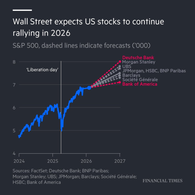 这种乐观情绪的核心驱动力,已经从当前的经济数据切换到了对 2026 年的宏观叙事上。 尽管近期通胀数据 PCE 显示出一定的粘性,且美联储内部出现分歧,但市场选择“视而不见”,转而全力交易 2026 年的复苏预期 。根据华尔街各大投行的最新展望中气氛普遍偏向乐观,认为 2026 年美股将延续两位数的涨幅,标普 500 指数有望冲击 7500 甚至 8000 点 。