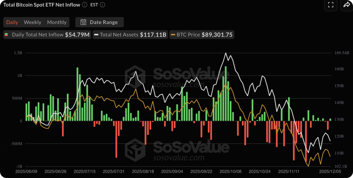 与美股的一片欢腾形成鲜明对比,加密二级市场在上周依然泛善可陈。BTC 价格一度跌破 8.9 万美元,出现了历史上非常罕见的年度背离风险,该走势打破了过去几个月两者高度联动的常态。