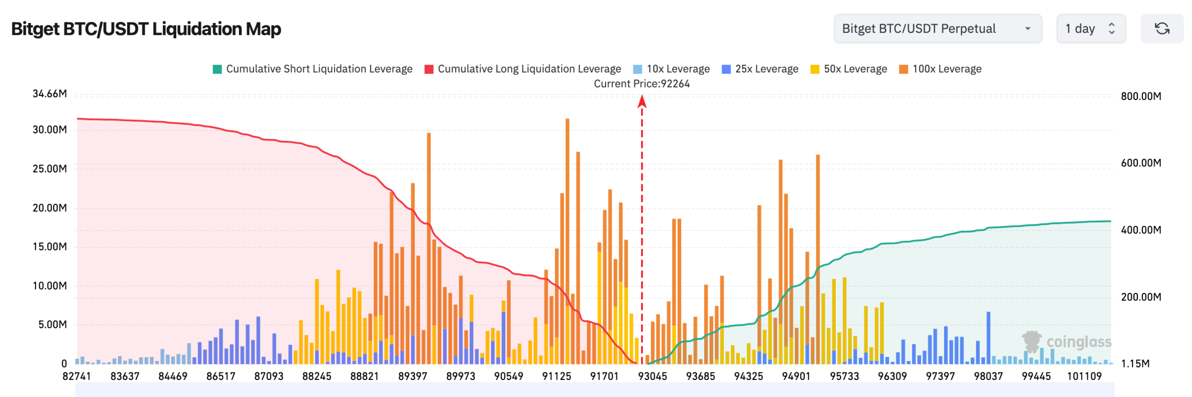 3、Bitget BTC/USDT 清算地图显示:BTC 当前价附近(约 92,000–93,000 美元)是多头高密度清算区,累计多单杠杆在此区域明显下滑,显示多头风险集中。而在价格上移区间(95,000 美元以上),空头累计杠杆快速累积,说明一旦突破,空头将面临集中爆仓压力。
