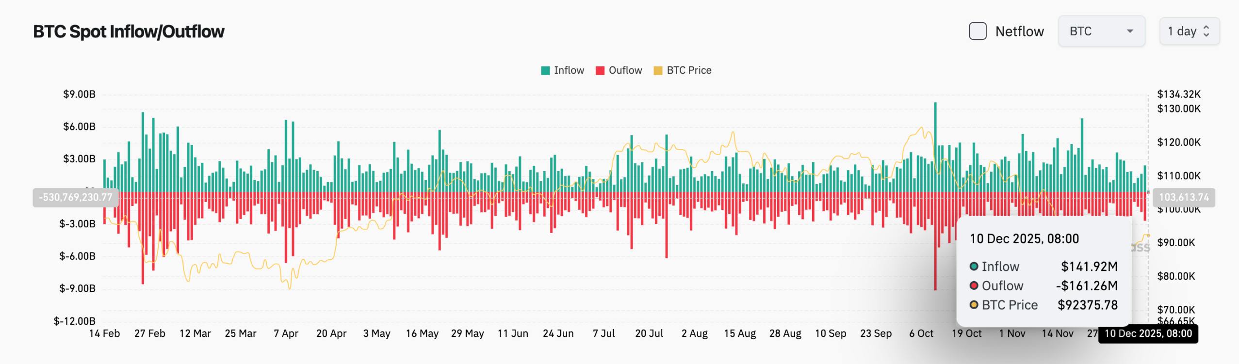 4、过去 24 小时内,BTC 现货流入约 1.42 亿美元,流出约 1.61 亿美元,净流出 0.19 亿美元。