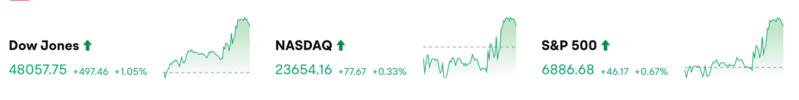 2、美股:道指涨 1.05%,标普 500 指数涨跌 0.67%,纳斯达克综合指数涨 0.33%。此外,英伟达(NVDA)跌 0.64%,Circle(CRCL)跌 0.53%,Strategy(MSTR)跌 2.3%。
