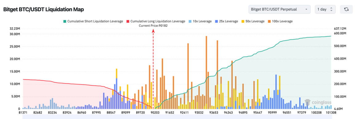 3、Bitget BTC/USDT 清算地图显示:BTC 当前价格附近(约 90,182 美元)是多头高杠杆(50–100x)最密集的爆仓点区间,一旦下跌会触发明显的多头连环爆仓。而下方空头累积爆仓量远大于上方多头,意味着如果价格继续上行,空头的爆仓推升力度更强,上涨动能更足。