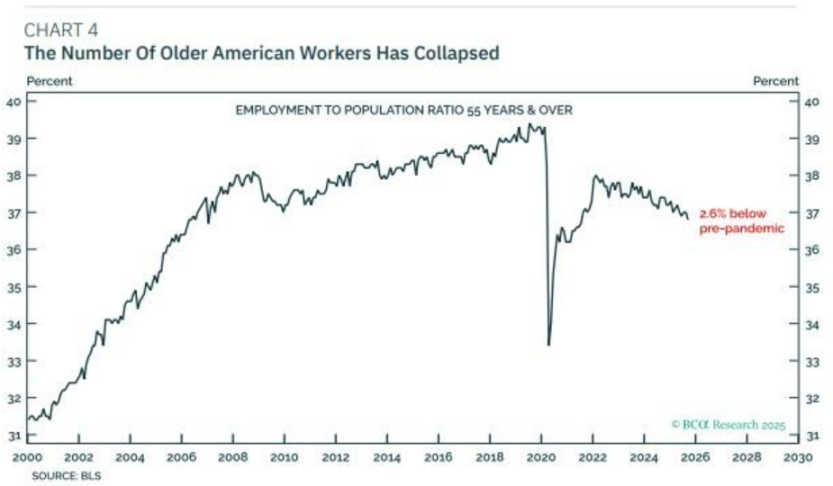 BCA Research 的报告揭示了一个被市场忽视的重要结构性变化:美国劳动力市场中老年工人的持续减少。报告称,疫情以来,美国出现了约 250 万的「超额退休」现象。这背后有两个主要原因:一是老年群体在疫情中更为脆弱,二是股市的强劲上涨为他们提前退休创造了财务条件。