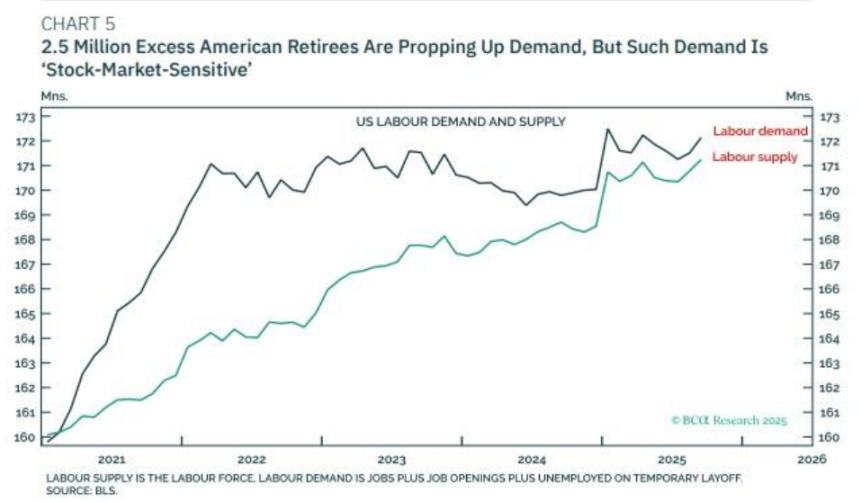 BCA Research 在报告中明确指出,当前美国经济的一个关键支撑来自于约 250 万「超额退休」人群的消费支出。这部分人群因新冠疫情后的股市繁荣而提前退休,他们的消费能力与股市表现直接挂钩,形成了一个「对股市敏感」的需求侧。