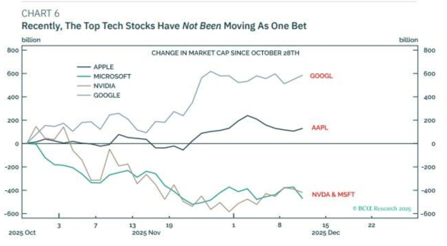 然而,一个积极的信号是,近期这些头部科技股的走势开始分化。报告指出,在过去一个半月里,当英伟达和微软的市值分别蒸发近 5000 亿美元时,Alphabet 和苹果的市值却分别增加了 6000 亿和 2000 亿美元。这种分化表明,市场并未将所有科技股视为一个整体,价值投资者仍在对部分公司的价格进行验证。