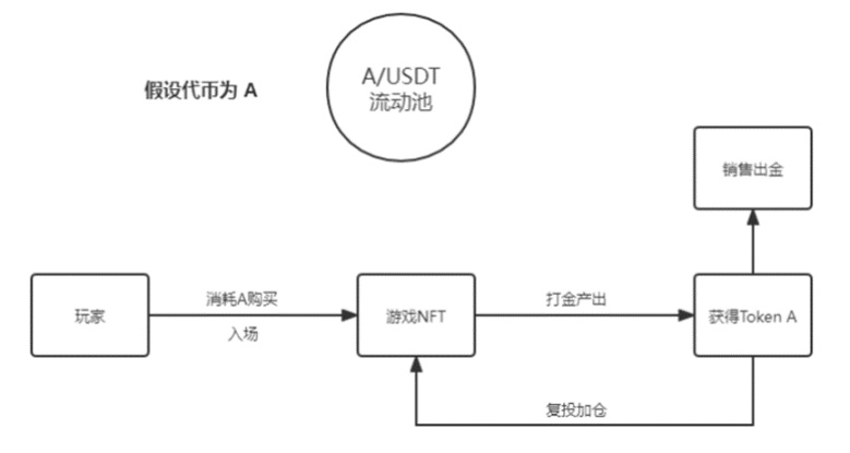 这是 2021 年的 Gamefi 热潮开始时,项目普遍用的一种模型,就是用 USDT 或 BNB 去买 NFT,通过游戏打出的是币(就是 TokenA),发现没有,挖矿的 Defi 基本就是这种模型。特点就是入场门槛固定,收益随币价波动。