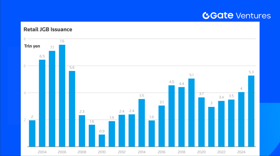 Japan is increasingly looking to mobilize its large household savings base, estimated at roughly seven trillion dollars, as a more stable source of demand for government bonds. While households currently hold only a small share of outstanding Japanese government debt, recent issuance data indicate a meaningful shift in behavior. Retail JGB issuance has risen steadily from below one trillion yen in 2010 to around 5.3 trillion yen in 2024, marking the highest annual level in more than a decade. This rebound reflects the return of positive yields and suggests that higher interest rates are now transmitting more effectively into household portfolio allocation decisions. (1)