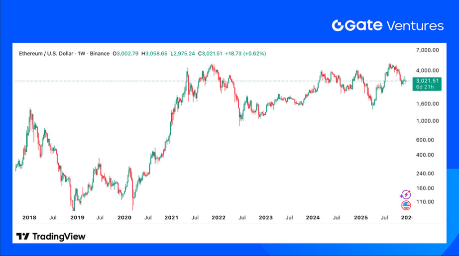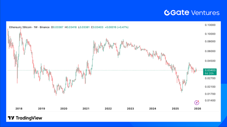 BTC edged up 0.55% over the past week, while ETH underperformed with a 1.97% decline. The ETH/BTC ratio fell 2.5% to 0.034, reflecting continued relative weakness in ETH. (5)