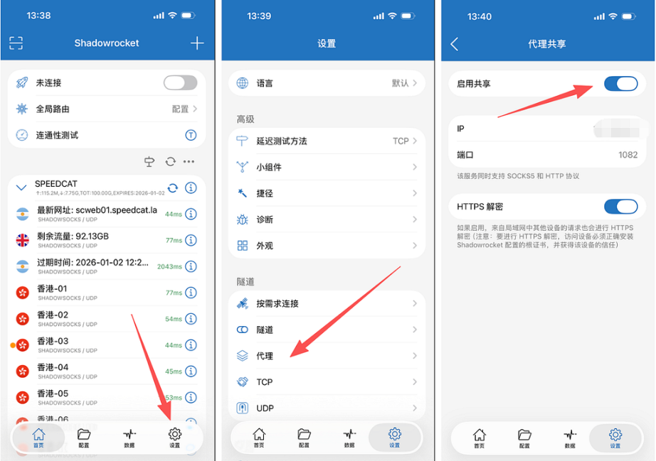 Shadowrocket 导入机场之后,就可以用上面的方法来共享翻墙网络给未翻墙手机了,具体步骤如下: