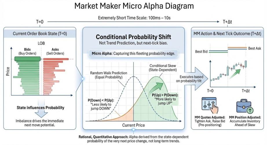 Micro alpha 是在极短时间尺度(~100ms 到 ~10s)上,对下一次价格变动方向 / 中间价漂移 / 成交不对称性的「条件概率偏移」,需要注意的是,mm 眼里的 alpha 不是趋势预测或者猜涨跌幅,只需要概率偏移,这和我们常说的 alpha 是两个东西。接下来用人话解释: