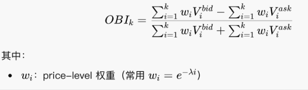 这个公式其实不难,就是个加和的比例逻辑。看买单多还是卖单多。OBI 趋近于 1,说明几乎都是出价买单,下面很厚。趋近于 -1 则是上面厚。趋近于 0 说明买卖比较对称。
