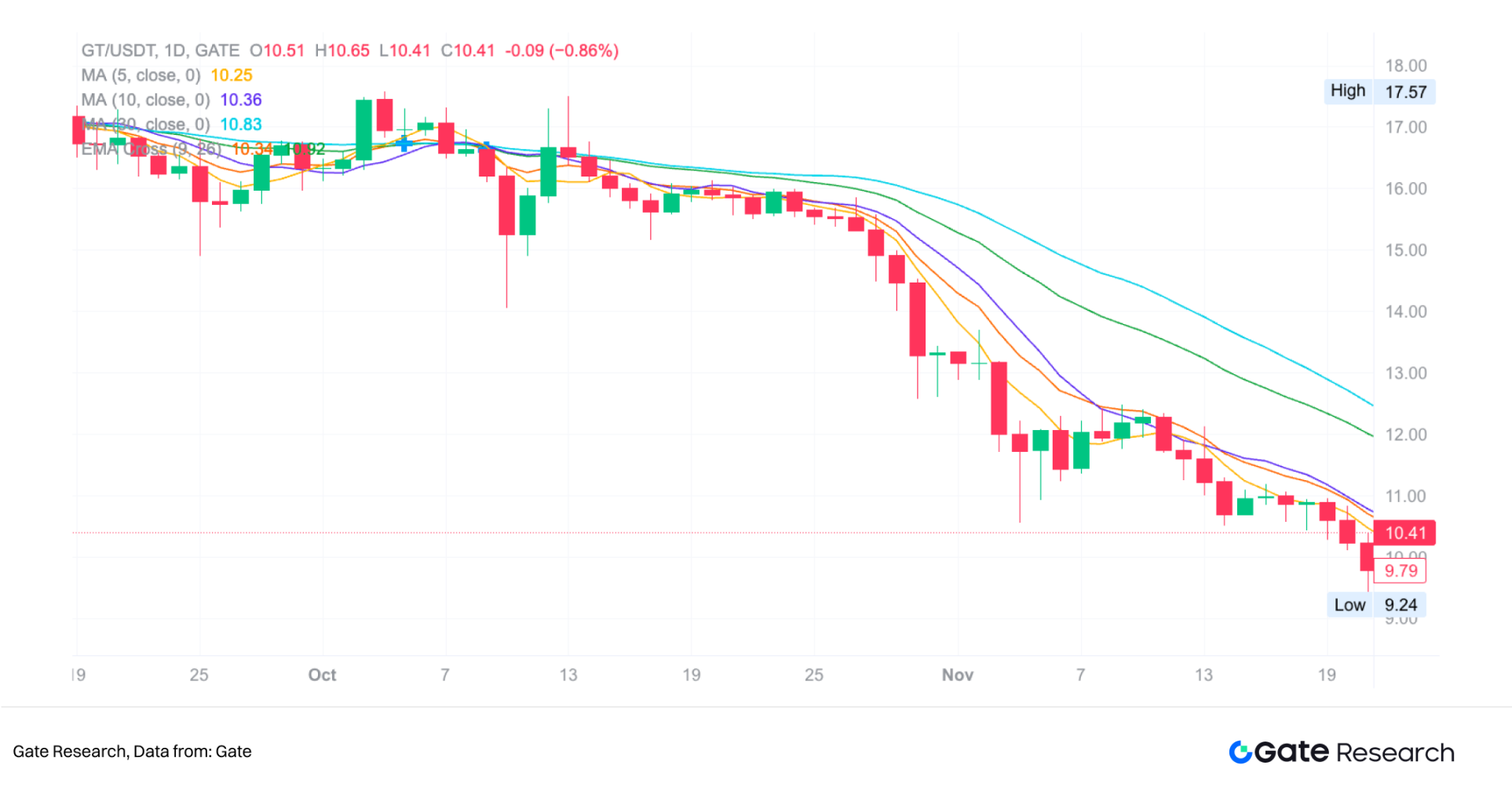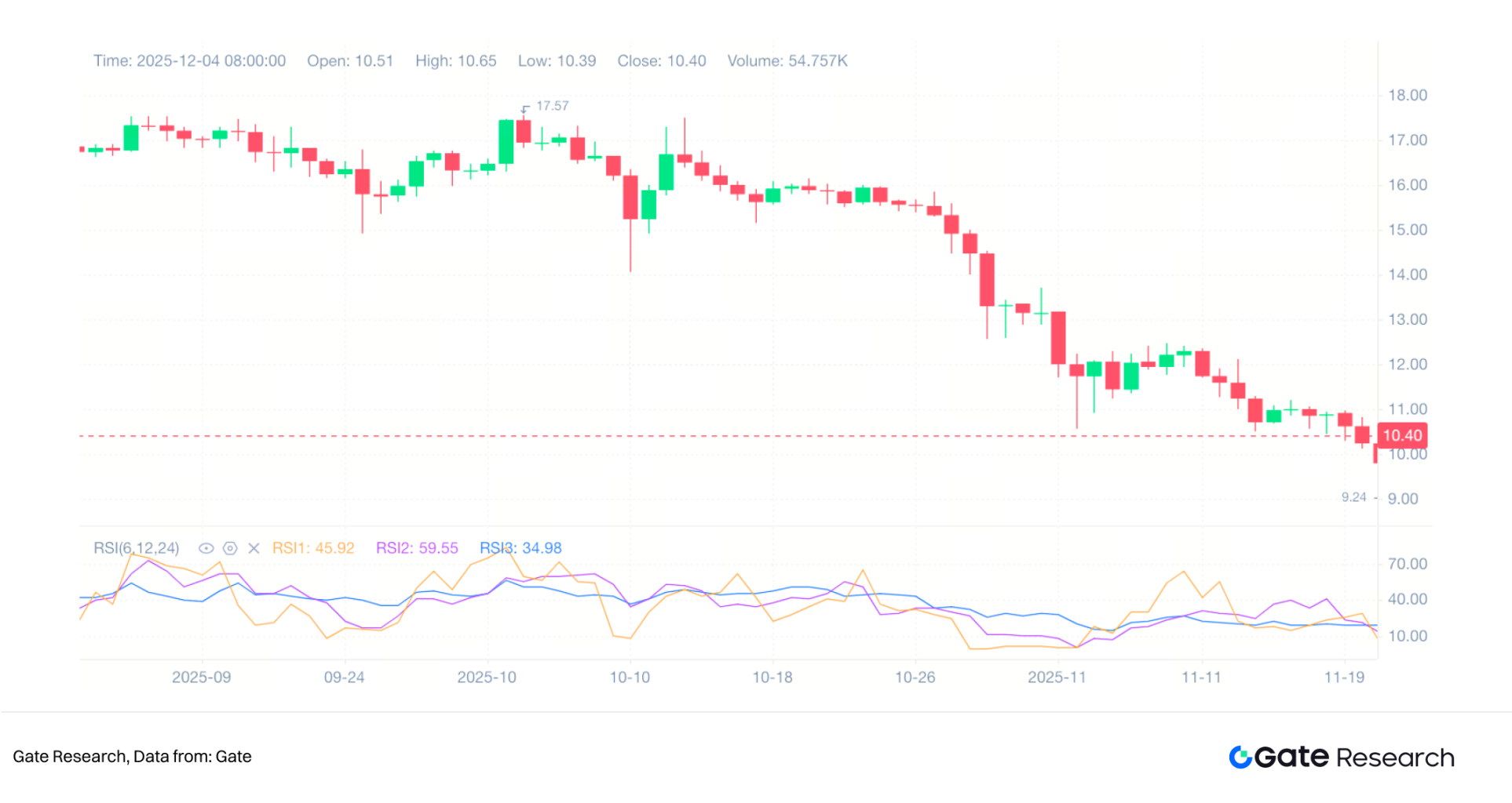 布林带的应用不仅限于观察趋势,还广泛用于波动性分析与价格位置判断。中轨通常被视为趋势的重要分界;价格持续运行在中轨上方代表市场处于相对强势,而当价格跌破并维持在中轨下方,则意味趋势转弱。图中自 10 月中旬跌破中轨后,价格始终无法重新站回,是下跌趋势形成的关键信号。
