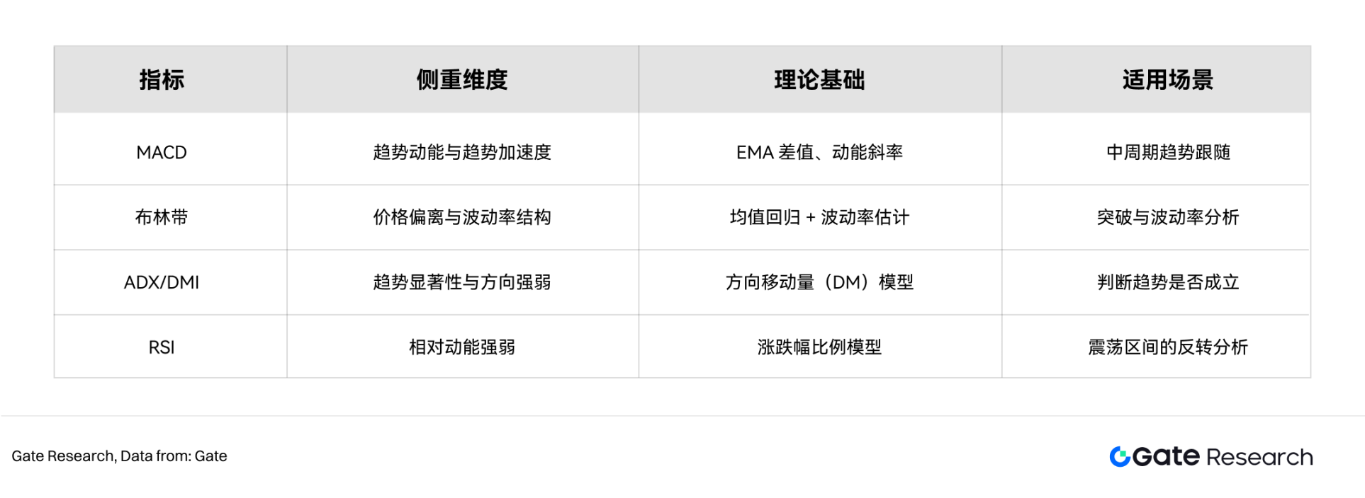 • 本报告选取 MACD、布林带、ADX/DMI 与 RSI 作为核心动量工具,分别从趋势方向、波动结构、趋势强度与市场情绪等维度刻画价格动能,形成互补分析体系。