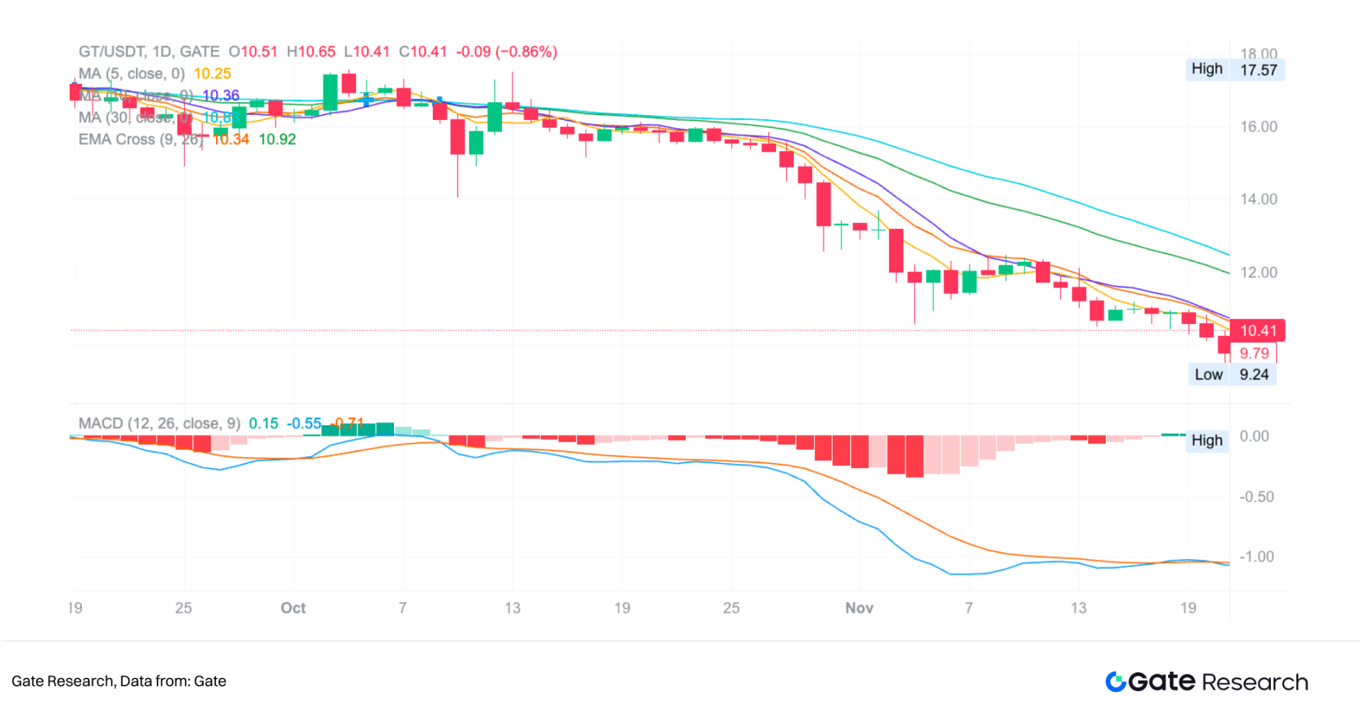 MACD 的零轴对于趋势判断具有重要意义。当 MACD 线位于零轴上方时,短期 EMA 高于长期 EMA,市场倾向多头结构;而在零轴下方时则表示空头动能占据主导。图中 11 月以来 MACD 长期停留在零轴下方,对应持续的下跌走势,呈现典型的空头趋势环境。