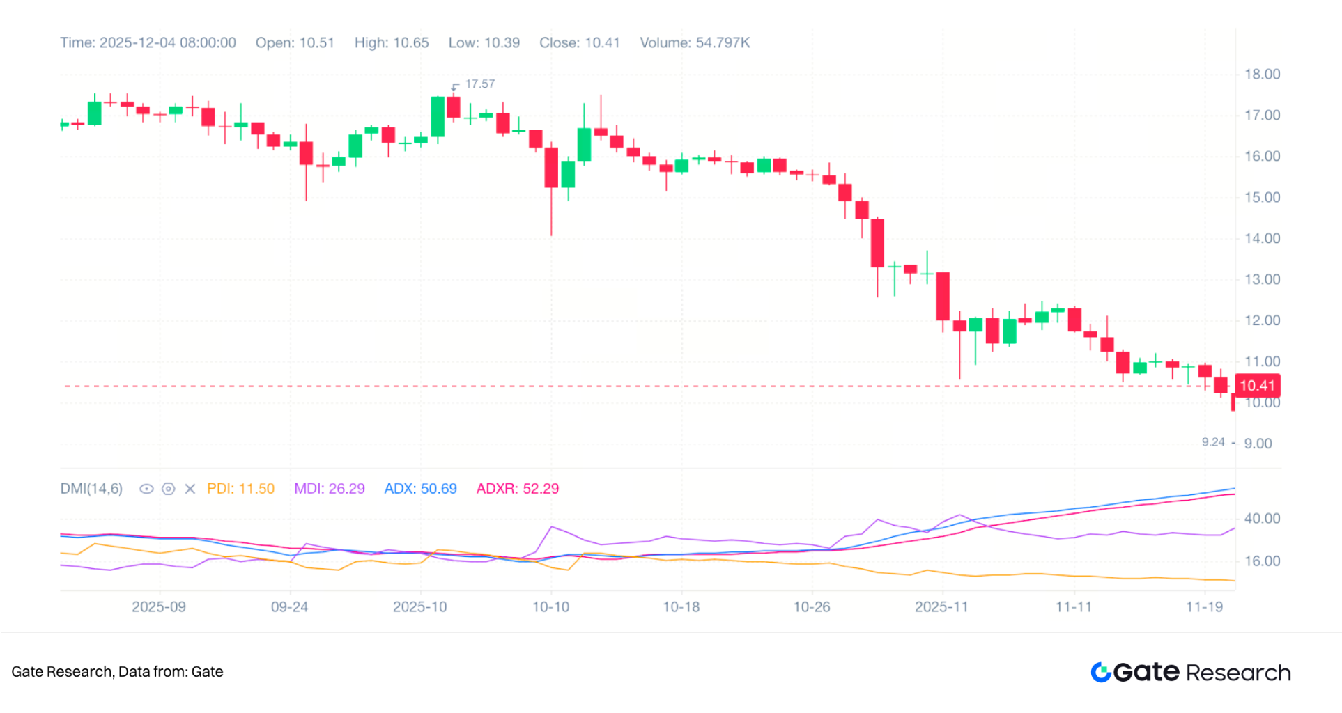 ADX/DMI 的最大价值在于提供趋势强弱与方向的双重判读。在实际应用中,ADX 作为趋势强度指标,其数值常作为判断市场是否进入趋势行情的参考。一般而言,当 ADX 高于 25 时,代表市场可能进入趋势阶段;低于 20 则往往是震荡市的表现。图中的 10 月下旬至 11 月,ADX 的持续走高与价格下跌同步,构成明确的空头趋势确认。