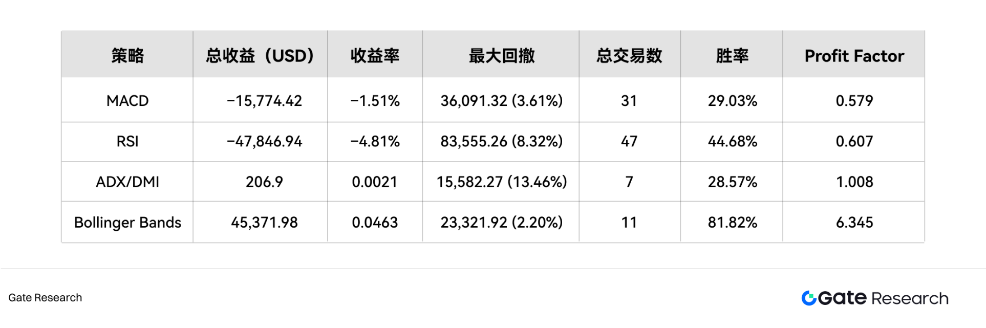 • 回测结果表明,动量策略高度依赖市场结构:震荡偏弱行情下,MACD 与 RSI 易受假信号影响;ADX/DMI 风险相对可控但收益有限;布林带突破在波动扩张阶段表现最佳,显示“波动型动量”在 BTC 市场更具优势。
