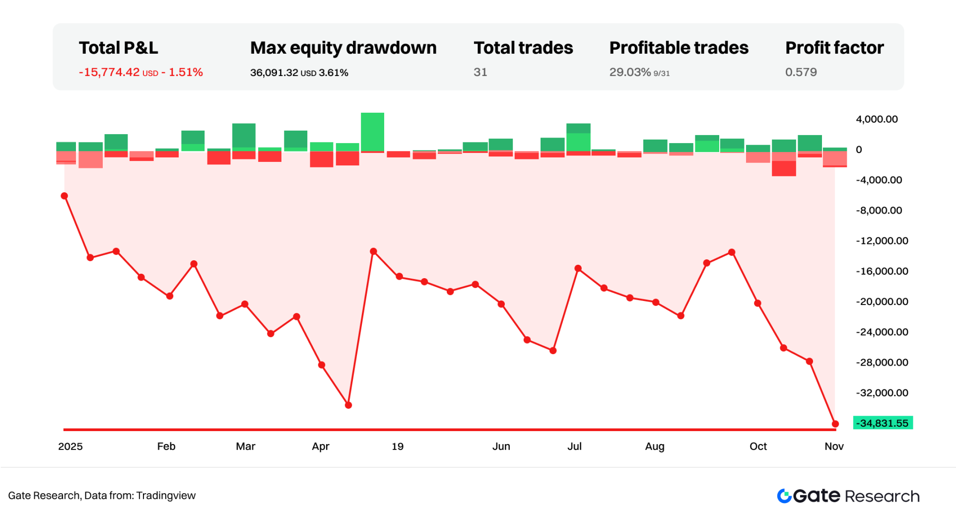 RSI 策略的回测表现同样为负,总收益为 −47,846.94 美元,回报率为 −4.81%,在四类策略中表现最弱。由于本区间整体偏向趋势下行,价格鲜少出现理想的反转走势,RSI 多次在下跌趋势中产生错误的超卖反弹信号,使亏损不断累积。最大回撤高达 83,555.26 美元,远高于其他策略,Profit Factor 为 0.607,尽管胜率达到 44.68%,但盈亏比极度不利,使策略整体收益表现低迷。