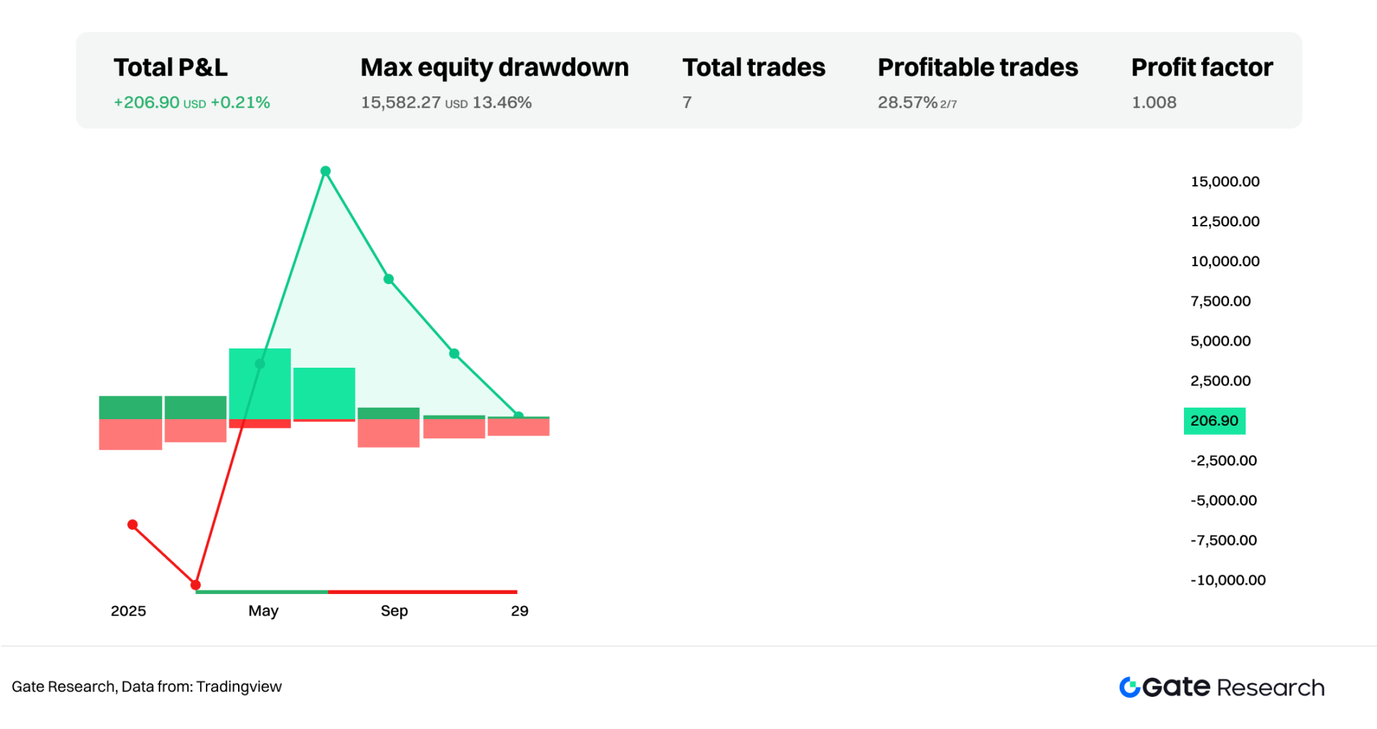 ADX/DMI 策略的交易次数最少,仅有 7 次进出场,反映出该指标对趋势条件要求较高,只在趋势明朗时才产生信号。其总收益为 206.90 美元,回报率约为 0.21%,虽称不上显著获利,但在震荡市中能有效避免过度交易。最大回撤为 13.46%,胜率不足三成,但 Profit Factor 为 1.008,略高于 1 ,显示该策略在趋势不足的一年中可以维持接近盈亏平衡的表现。