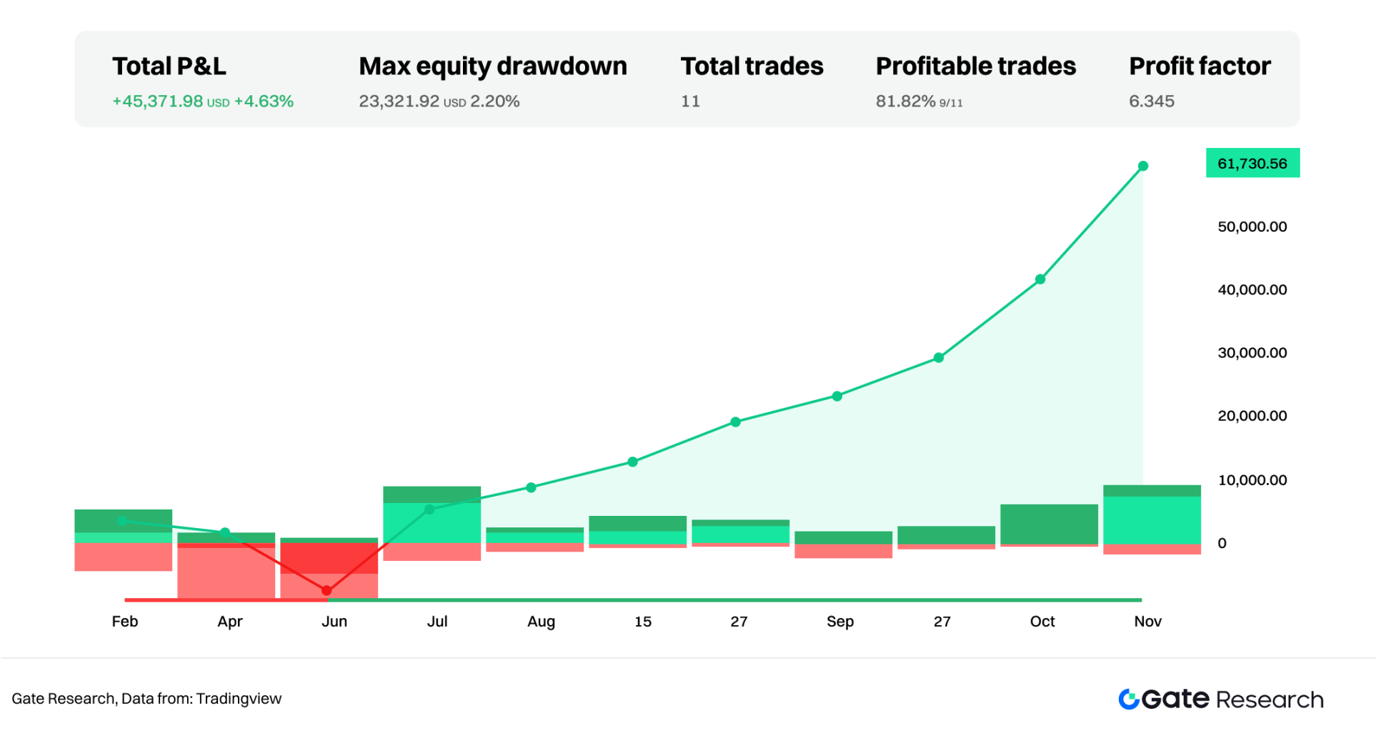 表现最为突出的是布林带突破策略,其总收益达到 45,371.98 美元,对应 4.63% 的回报率。在这一年度中,比特币价格经历多次波动扩张行情,布林带突破策略能够在波动快速扩大时捕捉价格突破带来的收益。在 11 次交易中有 9 次获利,胜率高达 81.82%,Profit Factor 达到 6.345,为所有策略中最高。其最大回撤仅为 2.20%,说明该策略不仅收益可观,而且回撤相对有限,在趋势与波动并存的市场环境中具有明显优势。