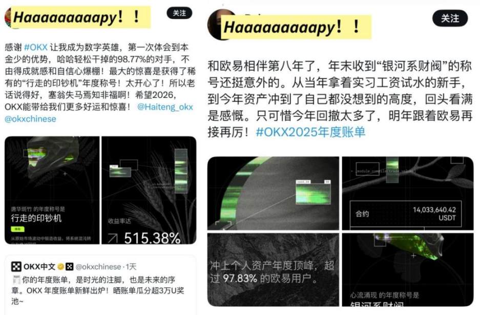 除了盈亏数字,OKX 年度账单的“用户画像”分类功能,让普通用户的晒单充满趣味并引发共鸣。根据交易行为与链上活动,用户被赋予“市场巅峰创奇”“行走的印钞机”“加密探索者”“银河系财阀”“波段艺术家”“稳健战略家”等年度称号。在推特上, 众多散户用户分享各自的“专属称号”:有用户晒出“银河系财阀”称号,其拥有个人资产 14467738.41USDT,升至年度巅峰,超越 97.83% 的欧易用户,并直言“以佛系态度参与 DeFi 项目,未曾料到账单带来意外惊喜”;一位标注“OKx 老朋友”的用户展示了全年 515.38% 的收益,其账单中低杠杆、多币种配置的交易记录,使其获得“行走的印钞机”的年度称号。不少用户表示,年度账单不仅是数据的汇总,更能让自己清晰洞察全年交易习惯的优劣——“账单显示我 30% 的交易属于冲动操作,2026 年需学会设置‘交易冷静期’”。