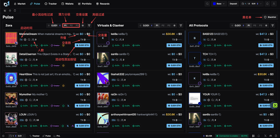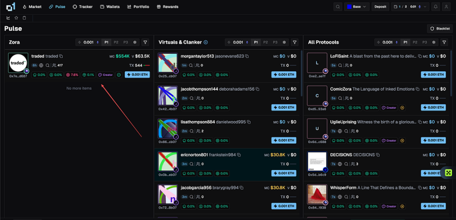 Pulse 是 O1 的“打新神器”,实时扫描 Base 和 Zora 生态的新启动项目(meme、NFT 等)。