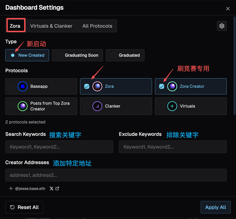 由于参与赛季奖励,需要在 Zora Creator Coins 和 Zora Content Coins 板块交易才有效,所以一般看 Zora 栏;