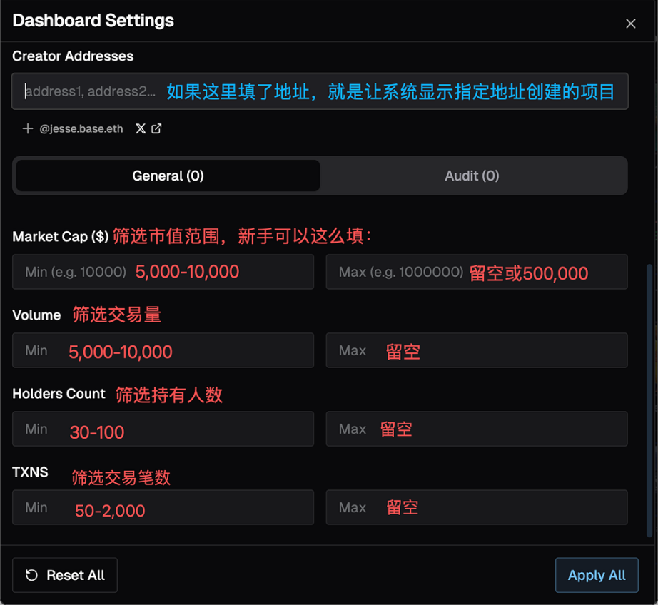 PS:Creator Addresses(创建者地址)表示只显示指定地址创建的项目,新手先留空,如果你有关注知名 KOL 或发行商的地址,可以填这里,只看他们的项目(防 rug 概率更高)。