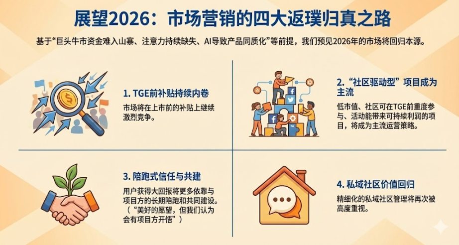 我对于 2026 市场营销趋势的思考前提:以国家和传统资巨头驱动的牛市会很难进入山寨市场;注意力会更加缺失,只关注公域流量的营销的 ROI 会无限接近负数;AI 的时代让项目更难从技术和产品上拉开差距而 X 上的“全民创作者”同质化内容会让用户逐步失去兴趣;更开放的监管催生更多其他公域和私域注意力的竞争格局